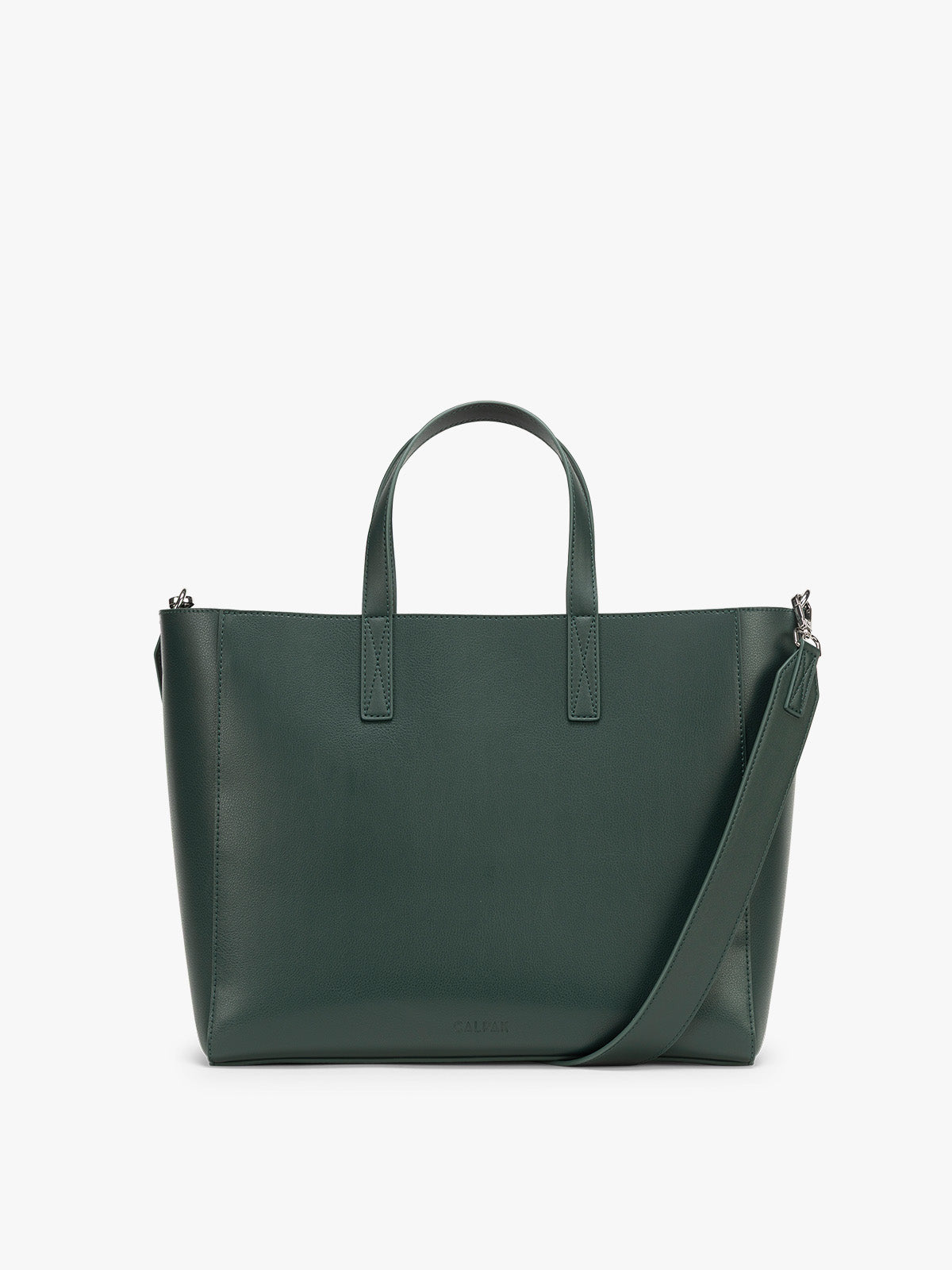 CALPAK Haven dark green Forest Haven tote bag held by a person against a beige background