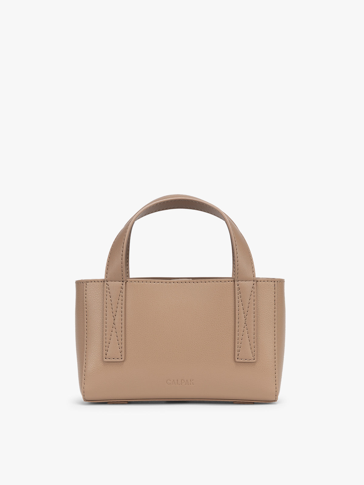 Person holding CALPAK Haven Mini Crossbody Bay in brown Taupe