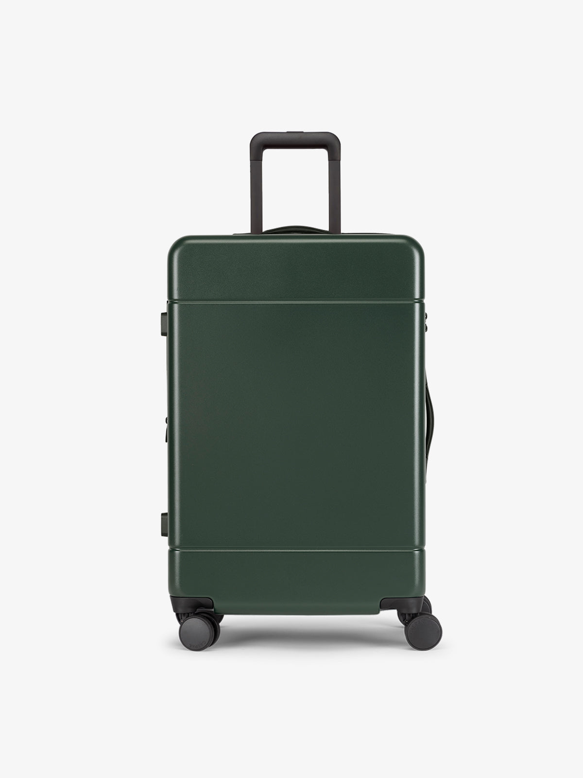 CALPAK Hue Medium Luggage in dark green Emerald that is opened to show capacity of luggage