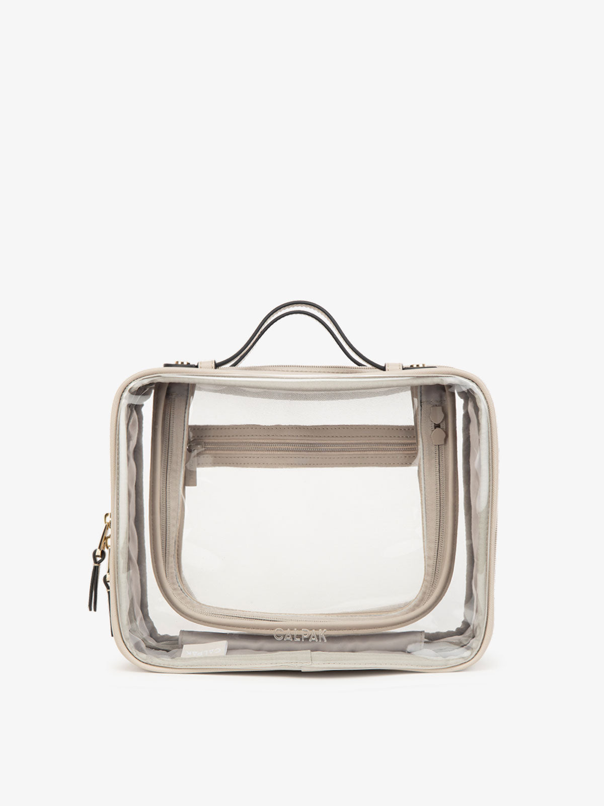The Large Clear Cosmetic Case is self-care approved and designed to meet all your beauty needs. With two spacious and clear compartments, you won't forget a thing with this large makeup bag. Plus, the top handle makes it a go-to beauty bag for travel, easily flattening to fit perfectly in your luggage or duffel bag.