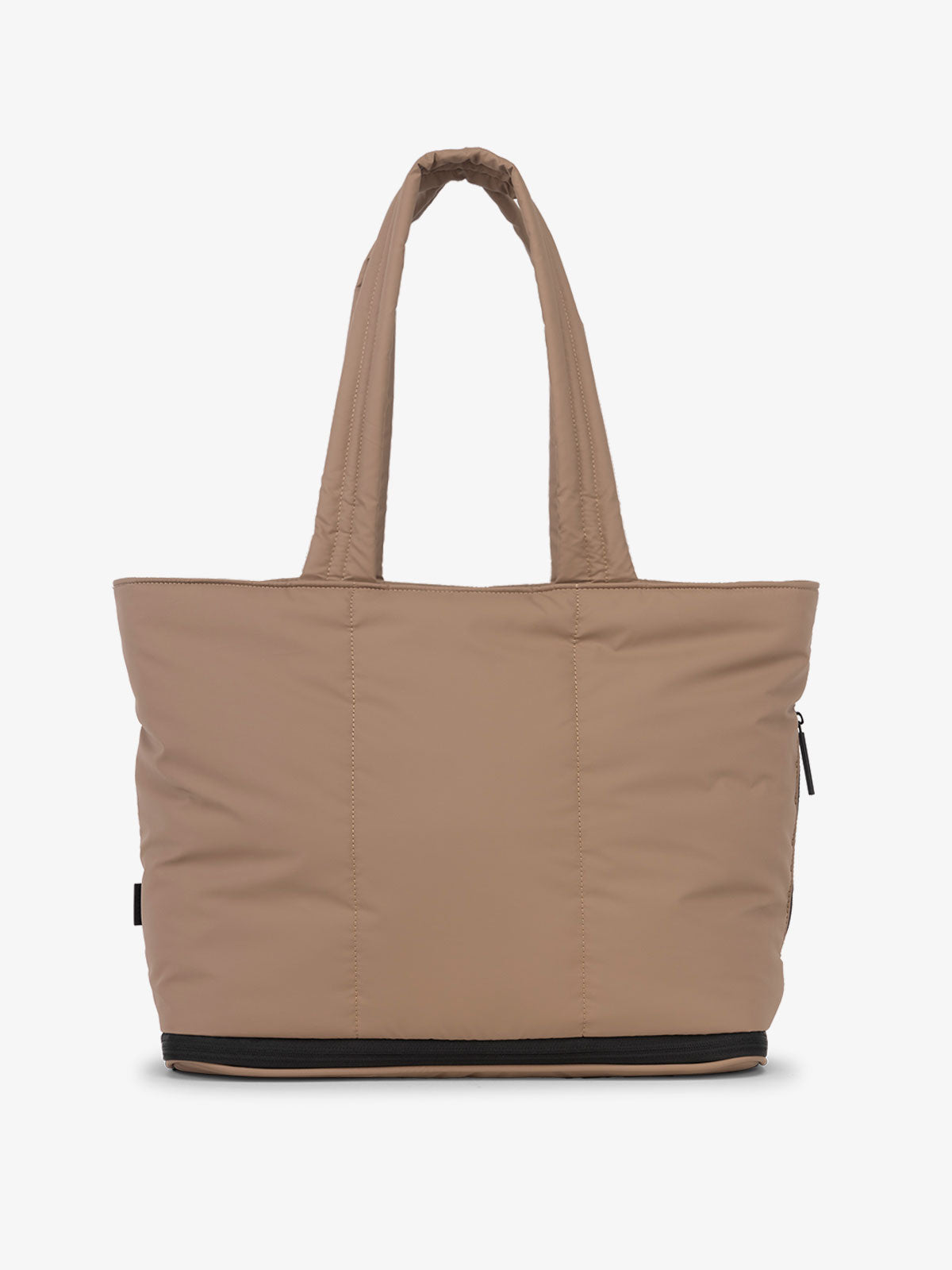 Model zipping up the expandable feature of the CALPAK Luka Expandable Tote in brown Chocolate