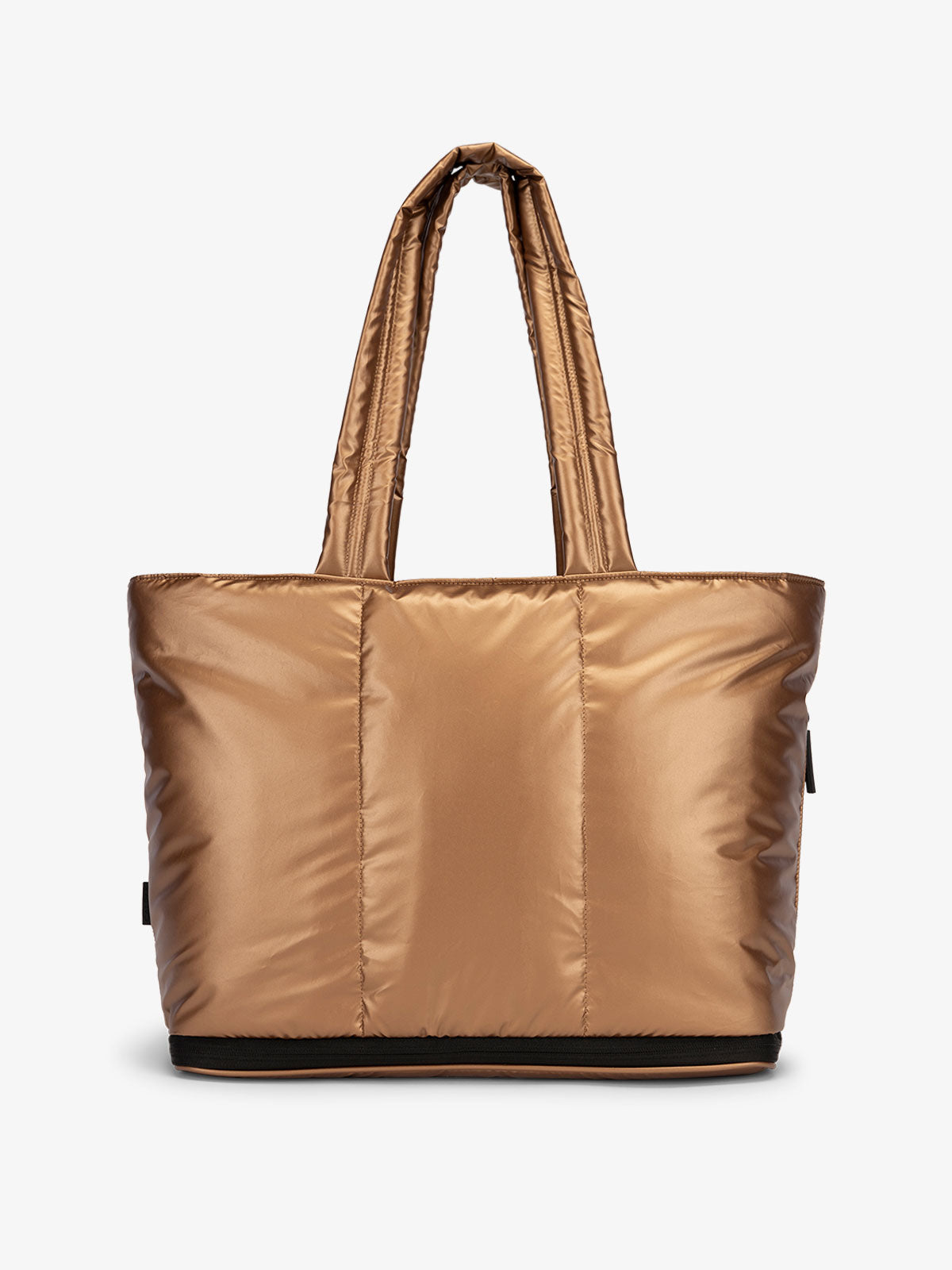 Close up image of plush material of the CALPAK Luka Expandable Tote in brown Chocolate