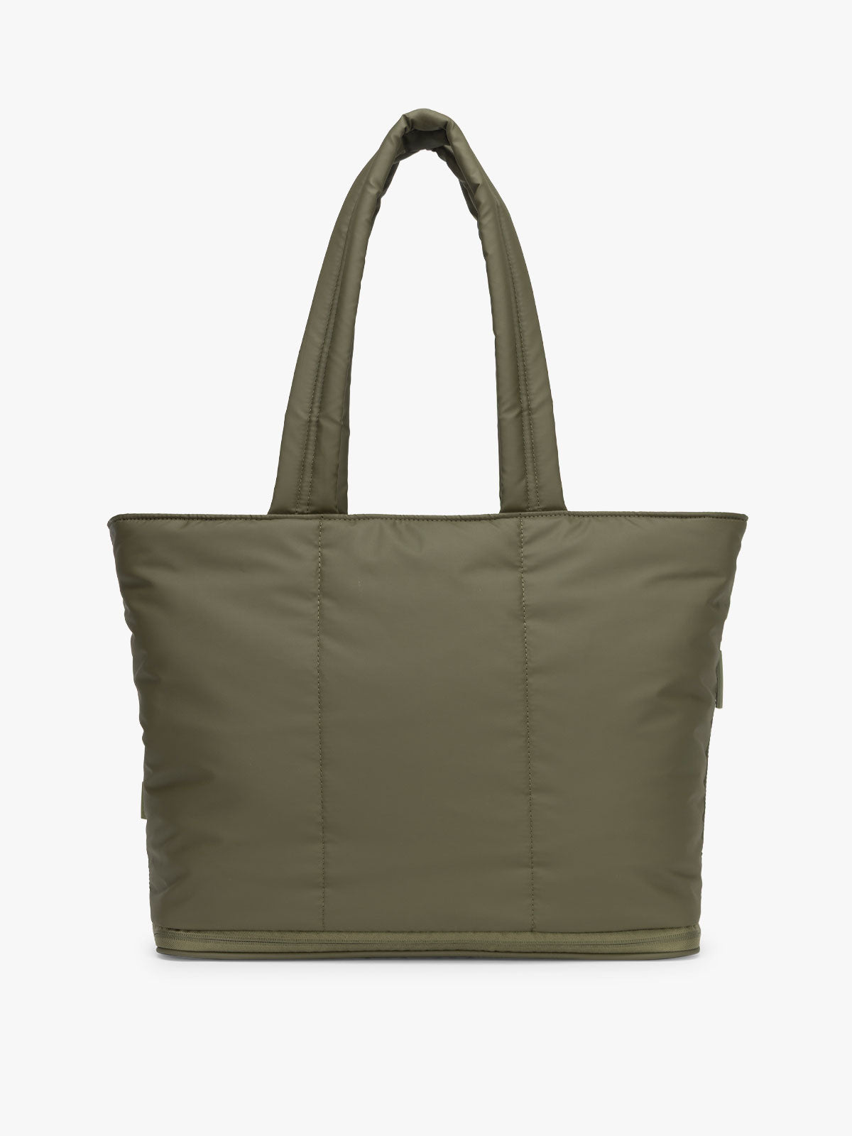 CALPAK Luka Expandable Tote in green with model putting in laptop