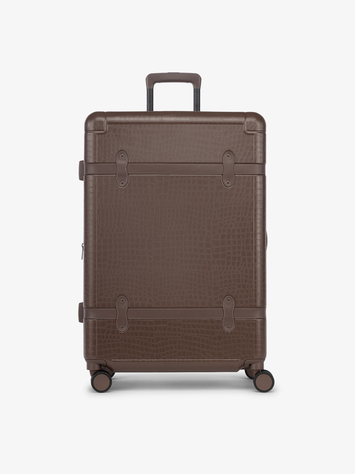 Discover the perfect blend of vintage charm and contemporary functionality with our Trnk Collection. This large 29-inch rolling luggage piece showcases a sleek hard shell adorned with a faux crocodile design, ensuring you travel in style. Equipped with spinner wheels, a built-in TSA-approved lock, and convenient pocket dividers, it offers both convenience and sophistication. With its expandable feature, you'll have ample space for all your essentials. Explore the world with confidence, knowing that our Trnk Collection has you covered for all your travel needs.